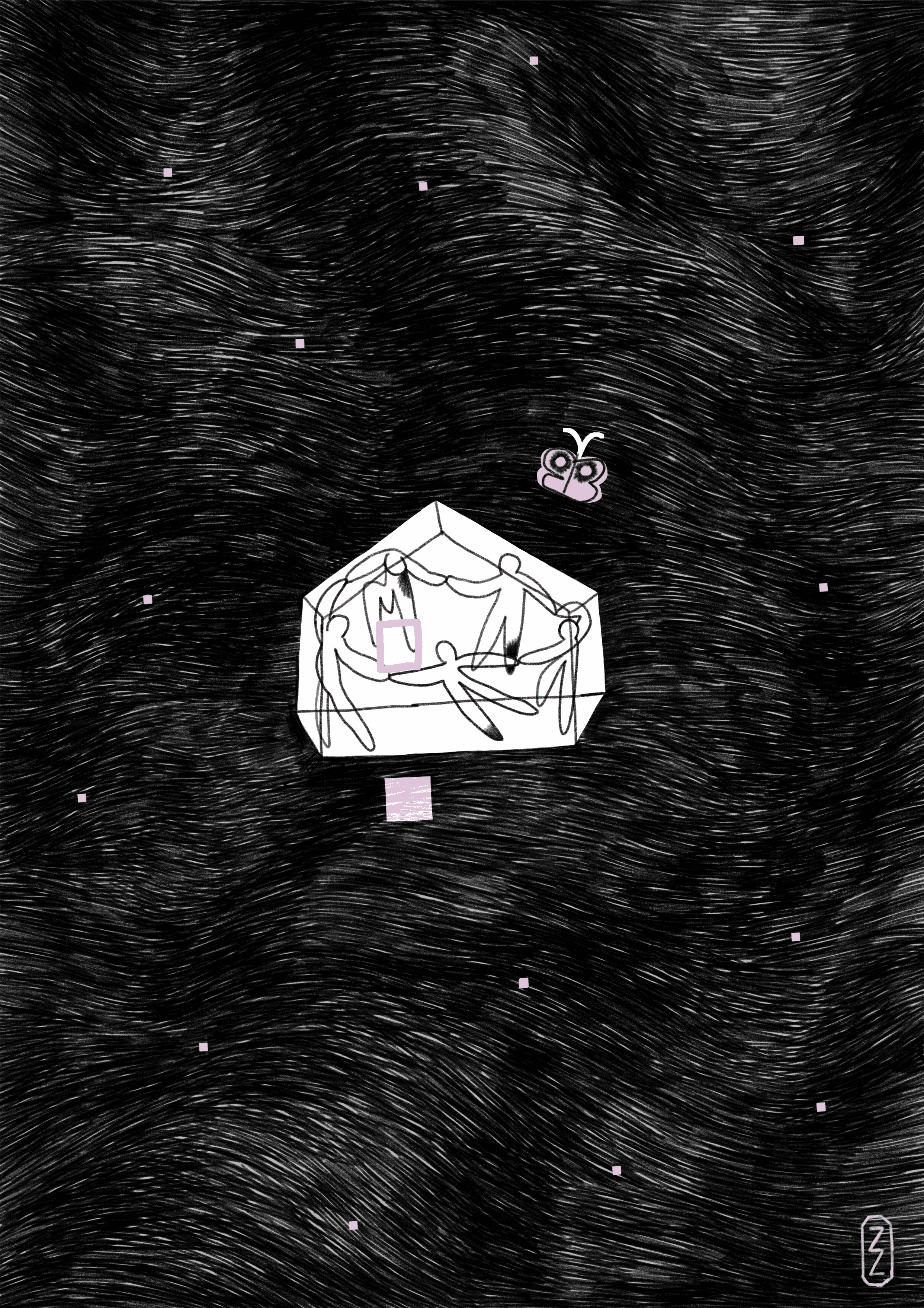 В данной работе я размышляла над темой коллективного взаимодействия и отделения пространства «для себя» от остального. В центре изображена коллективная коммуникация сообщества — семьи, а граница их комфортного пространства для общения и обмена чувствами, мыслями — это их дом. Они общаются посредством танца, для меня телесность — самый честный вид взаимодействия, тело не может врать. Внутри их зоны комфорта — гармония, а за пределом дома — неизвестность, темное пространство. Для меня это работа о том, как важно иметь свое место — дом, где тебя ждут, любят, всегда готовы выслушать и поддержать.
