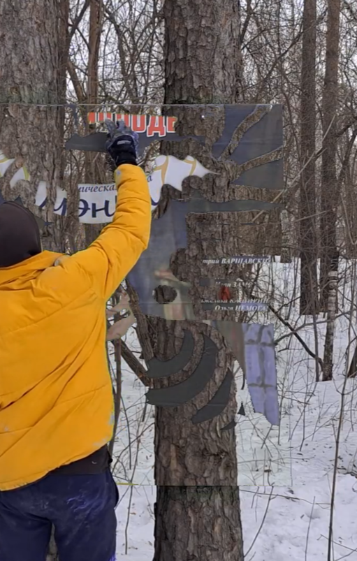Рядом с видео находится зеленый холст. Любой желающий может воспользоваться этим инструментом, вырезать и вставить в пустоту любое свое видео, став соавтором проекта. Это не просто возможность взаимодействия — это продолжение идеи диффузии, растворения границ между автором и зрителем, между цифровым и аналоговым, между записями прошлого и визуальными кодами будущего